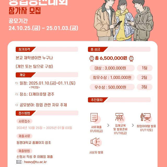 📣 2025년 스타트업 창업경진대회, 우리 대학 학생이라면 누구나 참여할 수 있어요. 1등 상금은 300만원이라고 하네요.😊 1월 3일에 신청이 마감되니 서둘