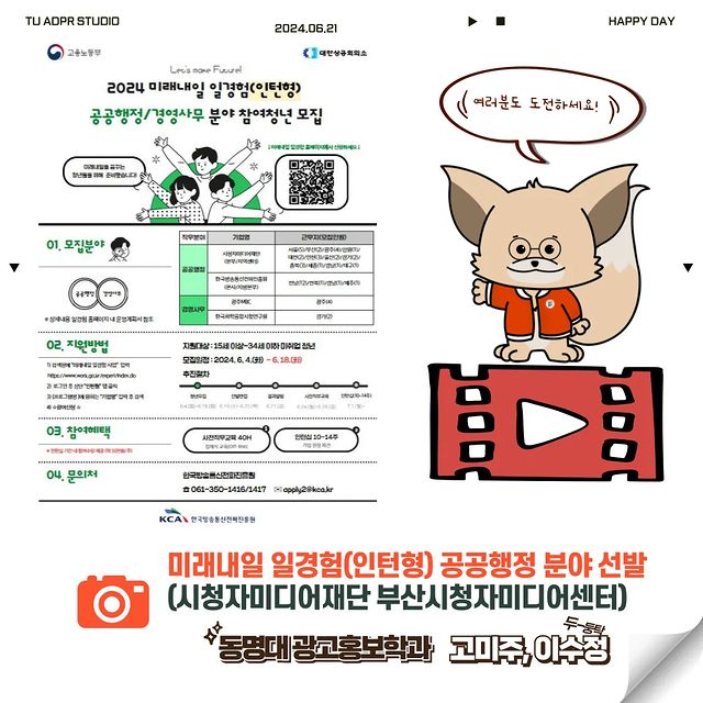 📣 미래내일 일경험(인턴형) 공공행정 분야에 고미주, 이수정 학생이 선발됐어요.✨️ 두 명의 학생은 7월부터 10주간 부산시청자미디어센터에서 인턴 활
