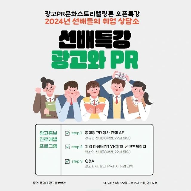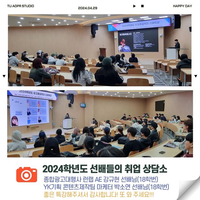 📣 2024년 선배들의 취업 상담소, 올해는 황우념 교수님의 광고PR문화스토리텔링론 수업의 <오픈특강> 형식으로 진행됩니다. 2024년 4월 29일, 오후2시부터