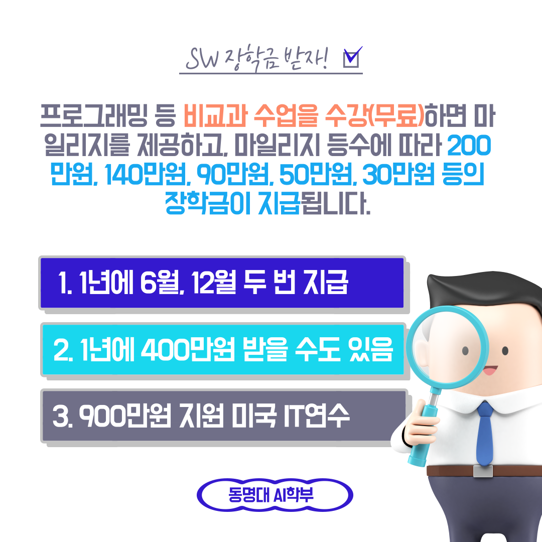 파이썬 프로그래밍 등 비교과 수업을 수강(무료)하면 마일리지가 제공되고, 마일리지 점수 순위에 따라 장학금을 지급합니다.