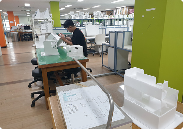 학년별 통합 건축 STUDIO 실습실과 레이저 커터 등 모형제작기구를 갖춘 조형 실습실이 있으며, 실사 출력 가능한 플로터를 구비하고 있습니다. 평면과 3D 작업을 할 수 있는 컴퓨터 실습실이 있으며, BIM 사업단 참여로 REVIT, ArchiCAD 등 대부분의 BIM 소프트웨어를 보유하여 수업에 활용하고 있습니다.