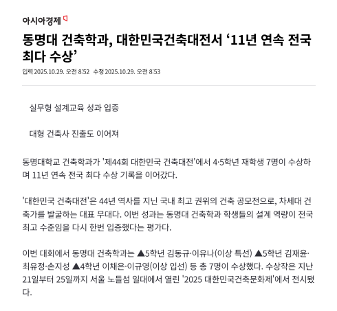 동명대 건축학과, 대한민국건축대전서 ‘11년 연속 전국 최다 수상’
