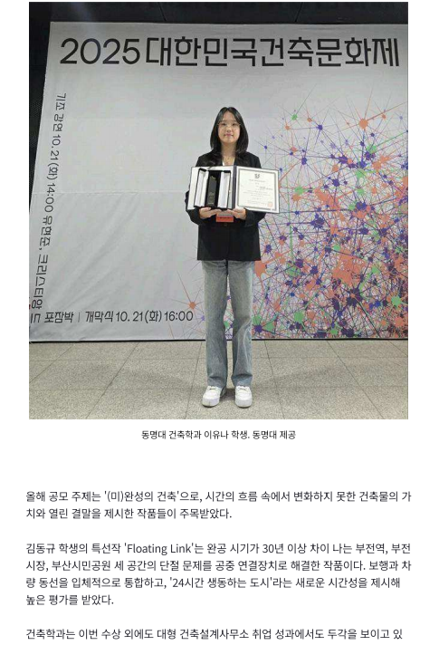 동명대 건축학과 부산국제건축대전 특선2명 등 총 20명 수상