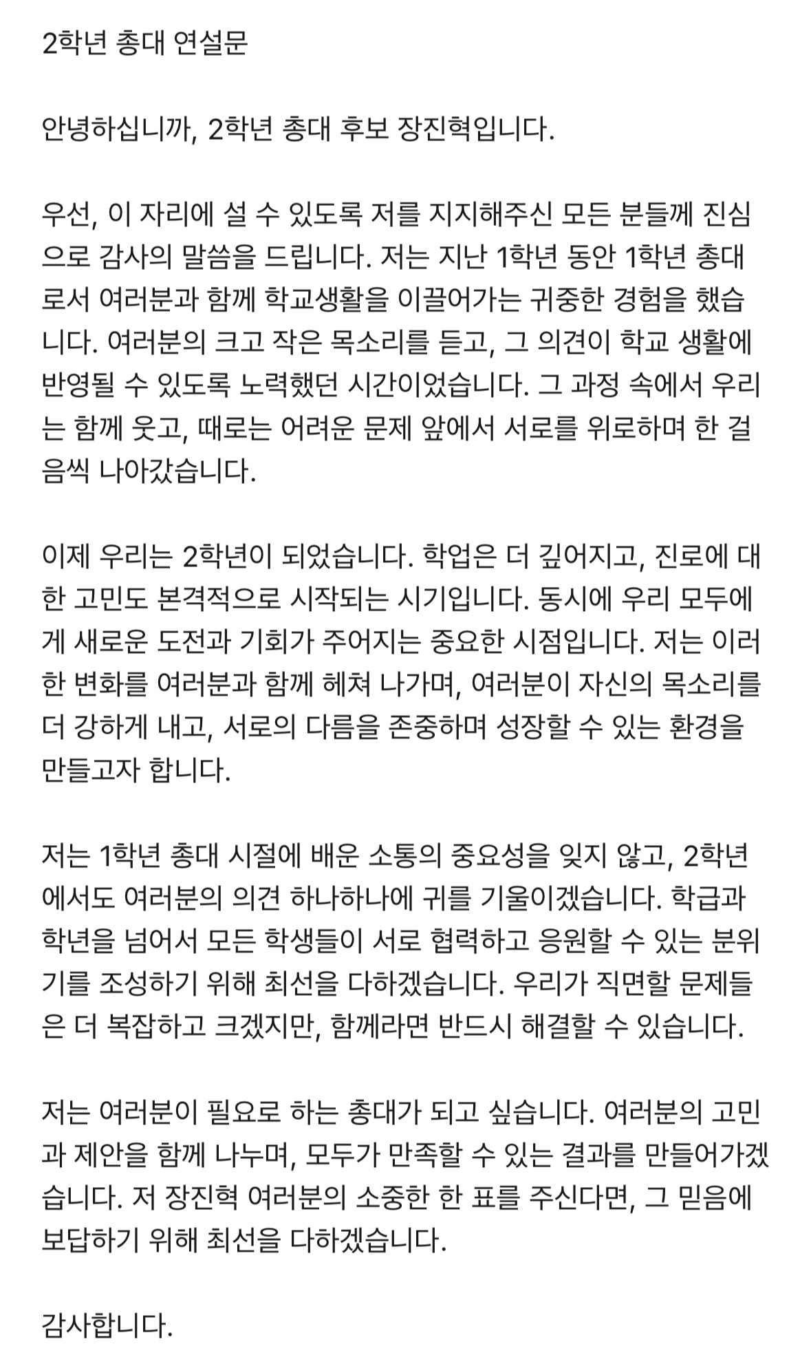 2학년 총대 차기 후보는 1학년 총대를 맡았던 장진혁 학우 단일 후보로 선거가 진행되었으며 과반수 이상의 찬성 득표를 얻어 2학년 차기 총대로 역임하게 되었습니다.