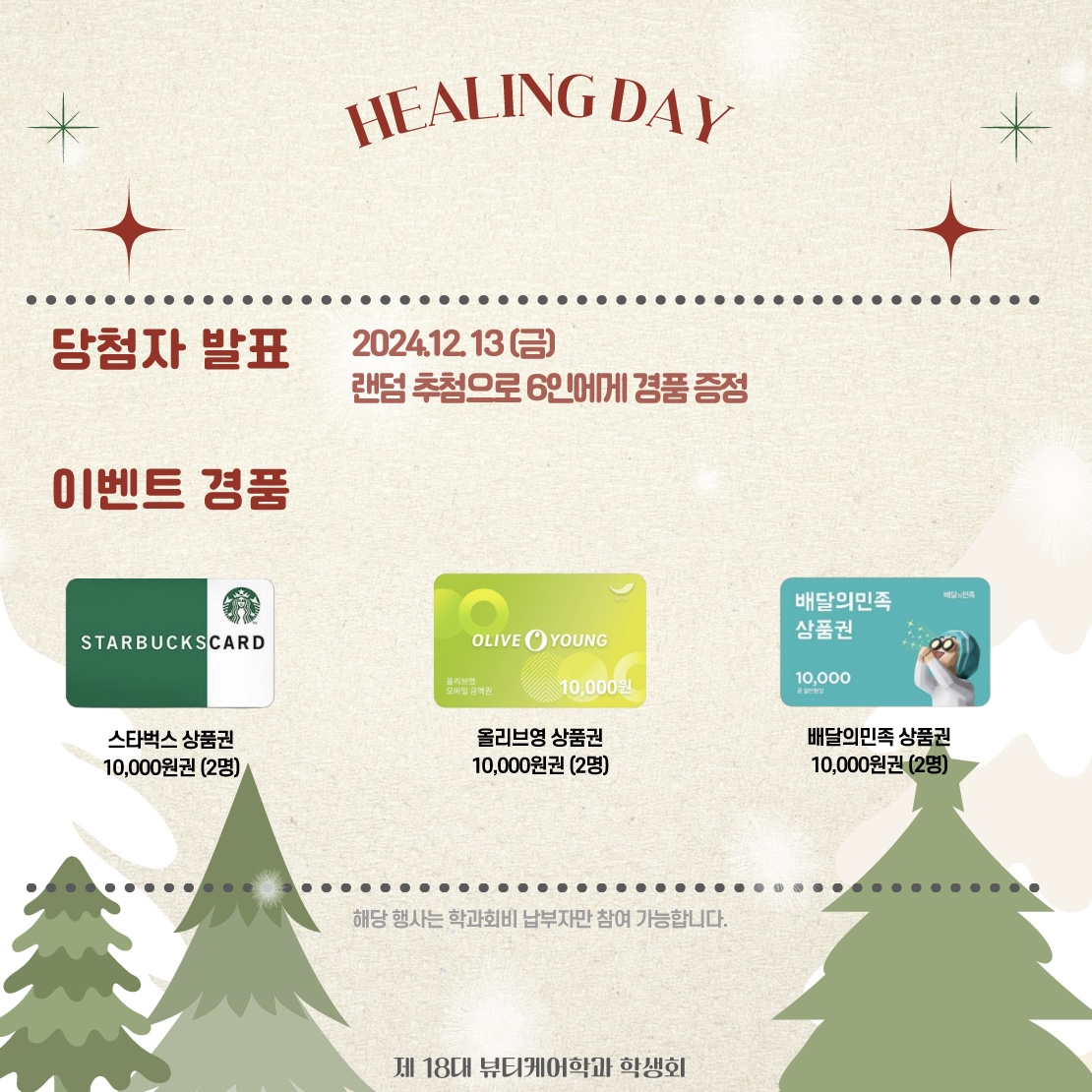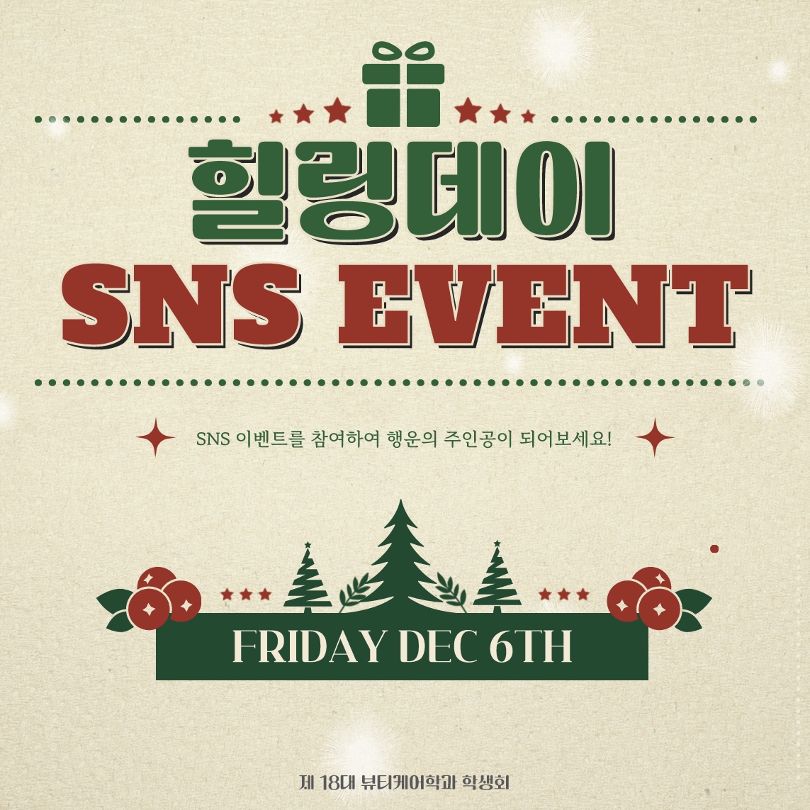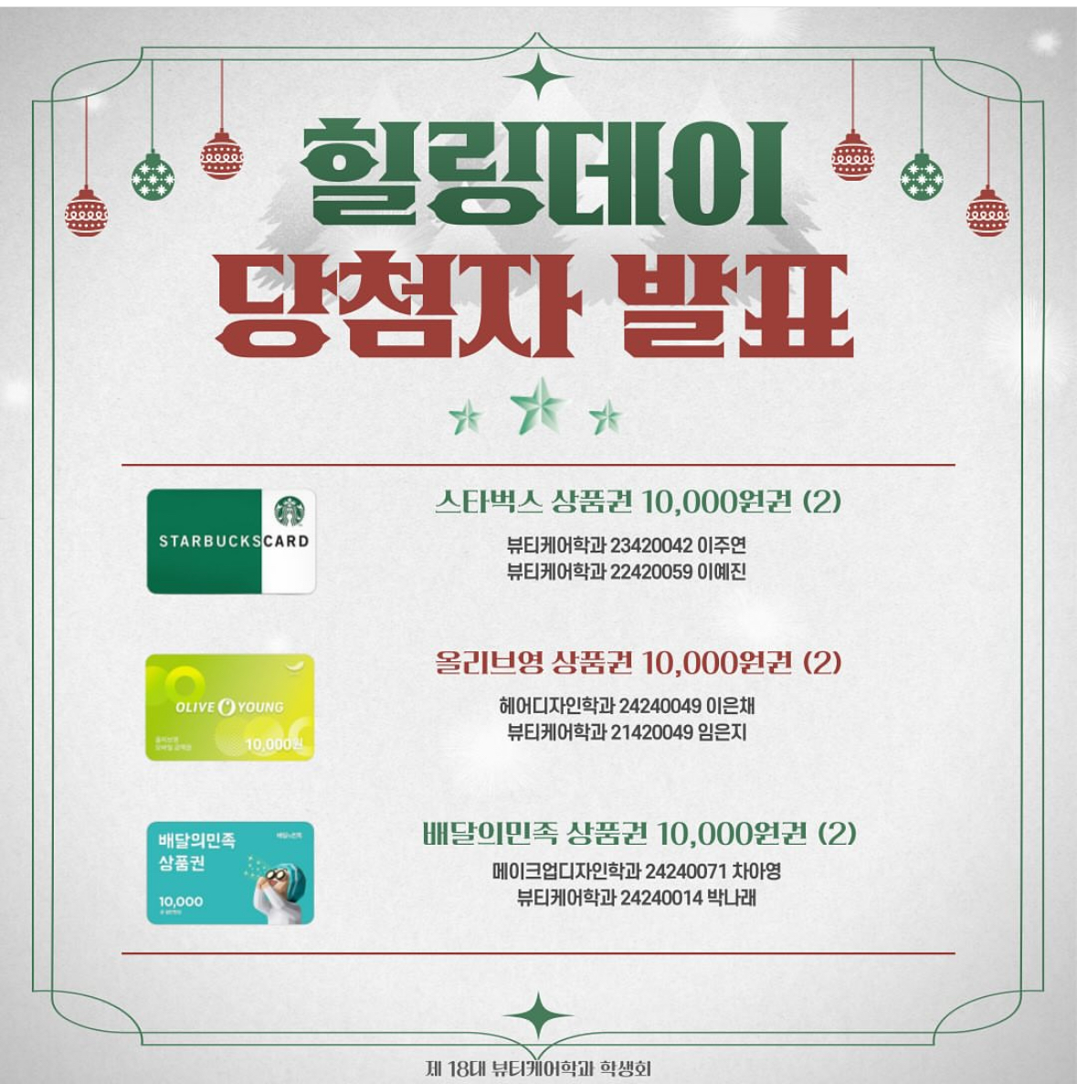 안녕하십니까, 제 18대 뷰티케어학과 학생회에서 준비한 12월 6일 (금)에 진행되었던 연말행사 힐링데이 이벤트를 소개해드리고자 합니다!
