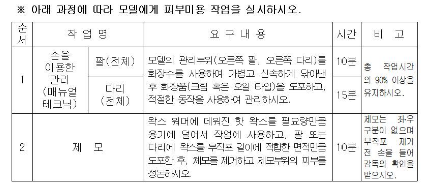 1. 과제는 모델의 오른손, 오른발에 습식매니큐어, 페디큐어 각각 30분씩 총 60분동안 과제에 맞는 작업을 수행하면 됩니다. 습식매니큐어(손관리)와 페디큐어(발관리)는 네일아트에서는 기초 작업 및 기술이라 볼 수 있으며 크게 소독, 네일 쉐입 변형, 큐티클을 불려 제거하는 기술, 컬러링에 해당됩니다. 컬러링은 풀코트, 프렌치, 딥프렌치, 그라데이션 중 하나가 출제됩니다. 네일의 모든 시험은 여러 개 중 하나가 출제되기 때문에 제시된 과제는 다 연습하셔야 하며, 1과제니 만큼 위생과 제품 세팅에 신경을 쓰셔야 합니다. 사소한 부분들을 놓치시면 많은 감점이 발생될 수 있습니다. 간과하지 마시고 필요한 제품들을 깔끔하게 정리하셔서 준비해주세요.