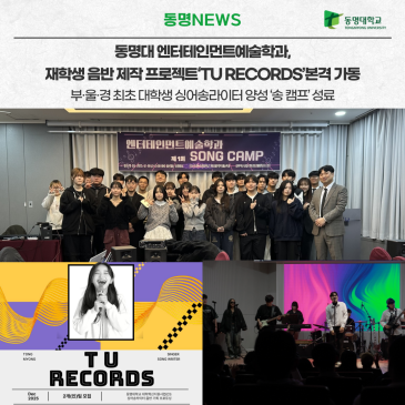 동명대 엔터테인먼트예술학과(학과장 이우영)는 지난 19일 재학생 음반 제작과 싱어송라이터 데뷔를 목표로 한 ‘송 캠프(Song Camp) 워크숍’을 성공적으로 개최했다고 밝혔다. 이번 캠프는 대학자율혁신사업(CI)의 일환으로 추진 중인 ‘엔터 잉큐베이팅 시스템-TU RECORDS’ 프로젝트의 핵심 프로그램으로, 재학생이 작사·작곡부터 연주, 레코딩, 믹스 및 음반 퍼블리싱(발매)에 이르기까지 전 과정을 직접 수행하는 실전형 프로 뮤지션 데뷔 프로젝트다. 특히 본 프로젝트는 동명대가 그동안 운영해 온 부산 콘텐츠코리아랩(B-CON) 창작과정의 경험과 교육 노하우를 토대로 설계된 확장형 프로그램이라는 점에서 의미가 크다. 이번 송 캠프에.......