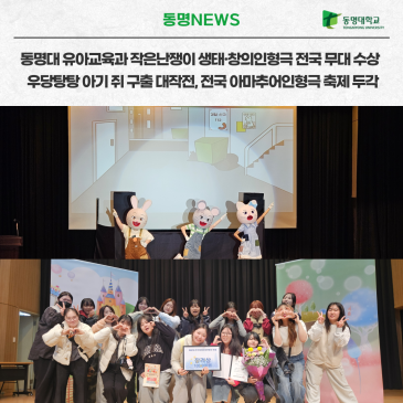 동명대 유아교육과 인형극 전공동아리 ‘작은난쟁이’(회장 3학년 박지양, 지도교수 윤정진)는 최근 2025 전국아마추어인형극축제에서 창작 인형극 「우당탕탕 아기 쥐 구출 대작전!」으로 장려상을 수상했다. 이번 작품은 ‘생태계와 창의성’을 주제로, 고양이·토끼·생쥐 등 유아에게 친숙한 동물을 통해 동식물과 더불어 살아가는 삶의 가치와 동물 실험의 문제점을 유아 눈높이에서 흥미롭게 풀어내 높은 평가를 받았다. 작은난쟁이는 대본 기획부터 인형 제작, 연기, 연출까지 전 과정을 학생들이 직접 준비해 완성도 높은 무대를 선보였다. 회장 박지양 학생은 “유아들이 인형극을 통해 즐거움과 의미를 함께 느끼길 바라는 마음으로 준비.......