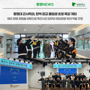 동명대 군사학과는 지난 19일 학과 졸업생인 특전사 현역 장교 초청 특강을 개최했다고 밝혔다. 이번 특강에는 동명대 군사학과 4기(2021년 졸업) 졸업생이자 현재 대한민국 육군 특수전사령부 소속 장교로 복무 중인 하○○ 대위를 초청했다. 하 대위는 이날 「특전사의 임무와 파병부대의 역할」이라는 주제로 강연을 펼쳤다. 그는 아크부대 파병 경험을 보유한 현역 장교로서, 실전적인 경험과 사례를 바탕으로 한 생생한 강연을 진행했다. 특전사의 주요 임무 수행 방식, 해외파병 부대의 임무 특성과 역할, 그리고 장교로서 요구되는 역량과 자세 등에 대해 설명했다. 이번 특강을 통해 군사학과 재학생들은 현역 장교의 실무 경험을 직접 듣.......