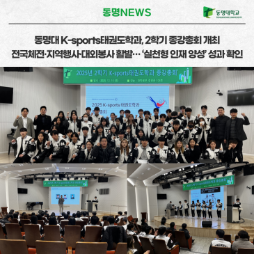동명대 K-sports태권도학과(학과장 원형진)는 16일 2025학년도 2학기 교육과정의 마무리를 알리는 종강총회를 개최했다. 한 학기 동안 학생들이 참여한 다양한 대외활동·봉사활동·전국체전 및 지역 연계 행사 성과를 공유하는 시간을 가졌다. 이번 종강총회에서는 단순한 학기 종료 행사를 넘어, 태권도를 통한 사회 기여와 현장 중심 교육 성과를 되돌아보는 자리로 마련됐다. 2025학년도 2학기 동안 태권도학과 학생들은 전국체전 및 전국 규모 스포츠 행사 지원, 지역 축제·공공기관 행사 태권도 시범 공연, 지역사회 체육 봉사 활동 등에 활발히 참여하며 대학의 사회적 책임을 실천했다. 특히 전국체전과 연계한 현장 지원 및 운영 보조 활.......