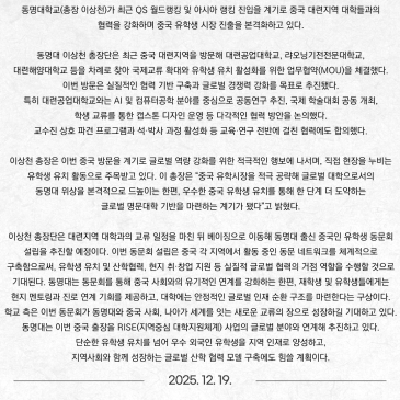 동명대학교(총장 이상천)가 최근 QS 월드랭킹 및 아시아 랭킹 진입을 계기로 중국 대련지역 대학들과의 협력을 강화하며 중국 유학생 시장 진출을 본격화하고 있다. 동명대 이상천 총장단은 최근 중국 대련지역을 방문해 대련공업대학교, 랴오닝기전전문대학교, 대련해양대학교 등을 차례로 찾아 국제교류 확대와 유학생 유치 활성화를 위한 업무협약(MOU)을 체결했다. 이번 방문은 실질적인 협력 기반 구축과 글로벌 경쟁력 강화를 목표로 추진됐다. 특히 대련공업대학교와는 AI 및 컴퓨터공학 분야를 중심으로 공동연구 추진, 국제 학술대회 공동 개최, 학생 교류를 통한 캡스톤 디자인 운영 등 다각적인 협력 방안을 논의했다. 교수진 상호 파.......