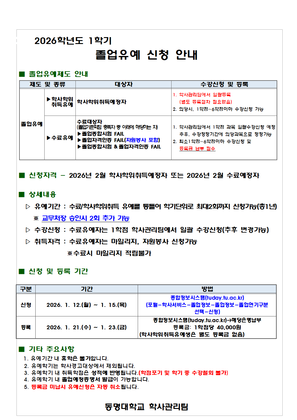 2025학년도 2학기 졸업유예 신청 안내
