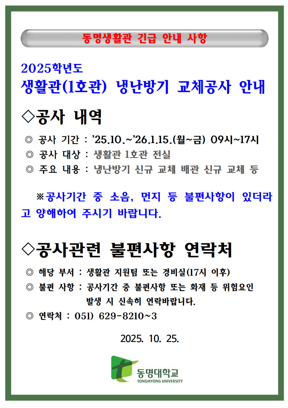 동명생활관 1호관 냉난방시설(에어컨) 교체 공사 안내