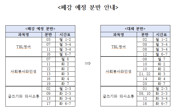 해당 분반을 수강 신청한 학생들은 확인하시고 대체 분반으로 이동해 주시기를 바랍니다.