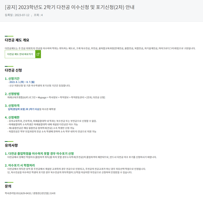 2023학년도 2학기 다전공 이수신청 및 포기신청(2차) 시행