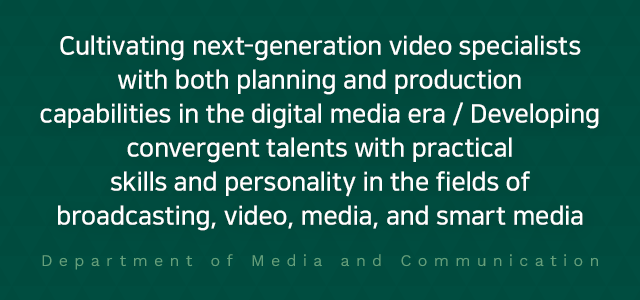 The Department of Media Communication is a department that trains professionals in broadcasting, one-person media, and social media in the 4th Industrial Age. It trains hands-on people in all courses of video production, including directing, planning, filming, editing, writers, and technical directors. In addition, we train professionals to work as reporters or planners in newspapers, broadcasting and Internet media, corporate public relations offices, and cultural contents-related companies. The curriculum focuses on the operation of practical courses in production and consists of social science insights through the theoretical subjects from a communication perspective that supports practical skills.