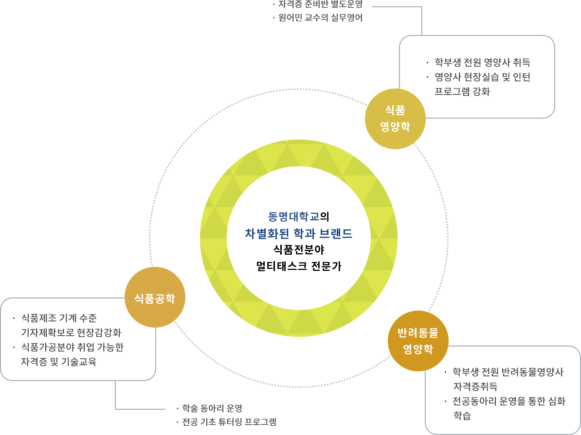 - 반려동물 영양학 트랙: 사료과학개론, 동물생리학, 사료가공조리학 및 실습, 동물보건학, 반려동물영양학, 반려동물 식사료요법, 반려동물 생명윤리학 등