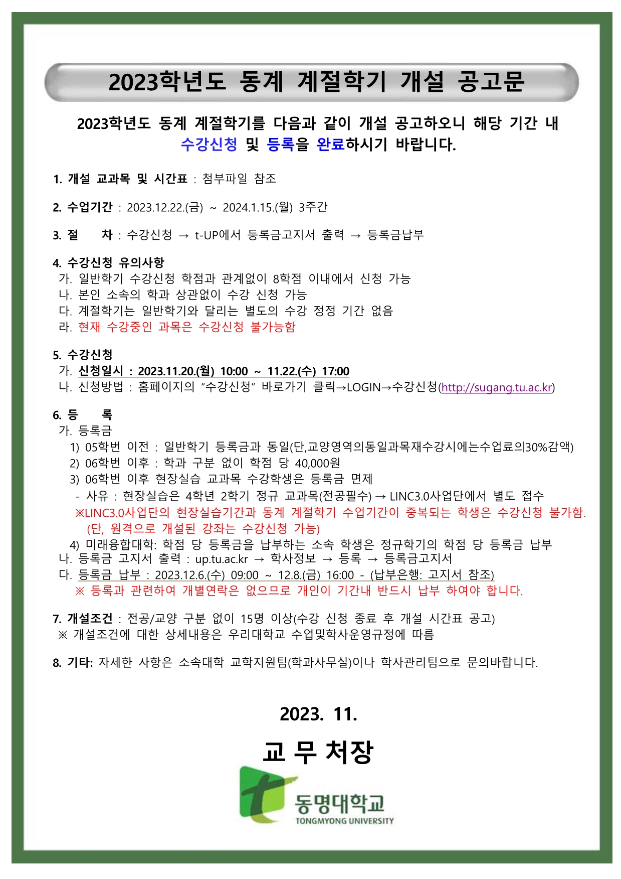 2023학년도 동계 계절학기 수강신청 안내