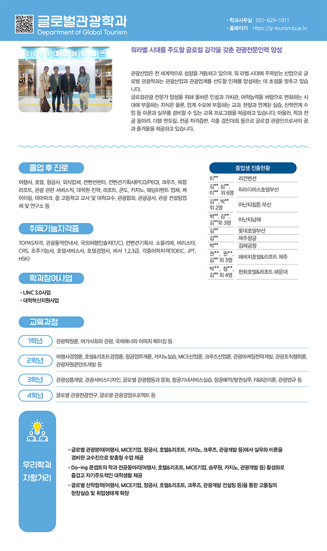 - 글로벌 관광분야(여행사, MICE기업, 항공사, 호텔&리조트, 카지노, 크루즈, 관광개발 등)에서 실무와 이론을 겸비한 교수진으로 맞춤형 수업 제공