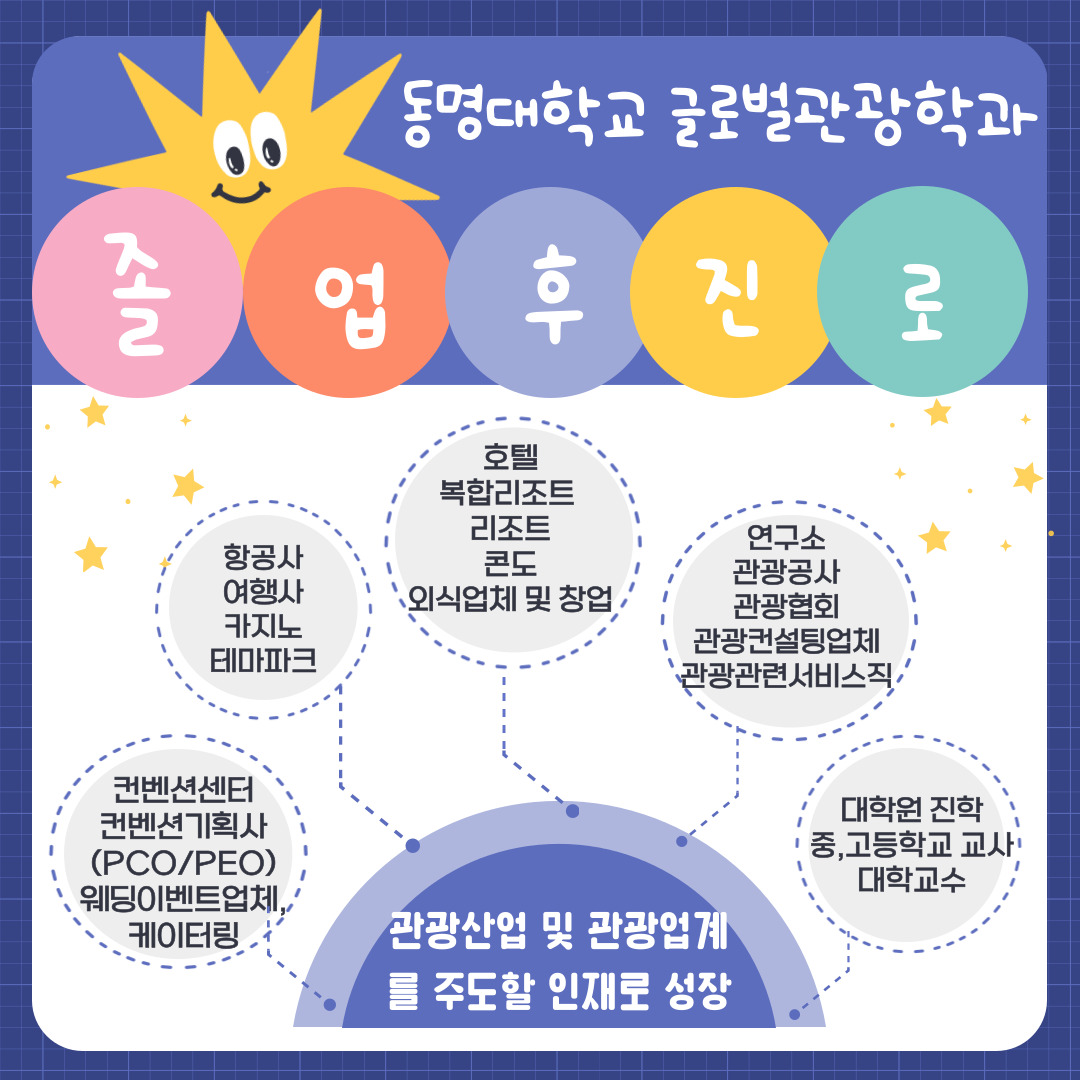 | 졸업 후 진로 | 여행사, 호텔, 항공사, 외식업체, 컨벤션센터, 컨벤션기획사(PCO/PEO), 크루즈, 복합 리조트, 관광 관련 서비스직, 대학원 진학, 리조트, 콘도, 카지노, 웨딩이벤트 업체, 케이터링, 테마파크, 중 고등학교 교사 및 대학교수, 관광협회, 관광공사, 관광 컨설팅업체 및 연구소 등 |