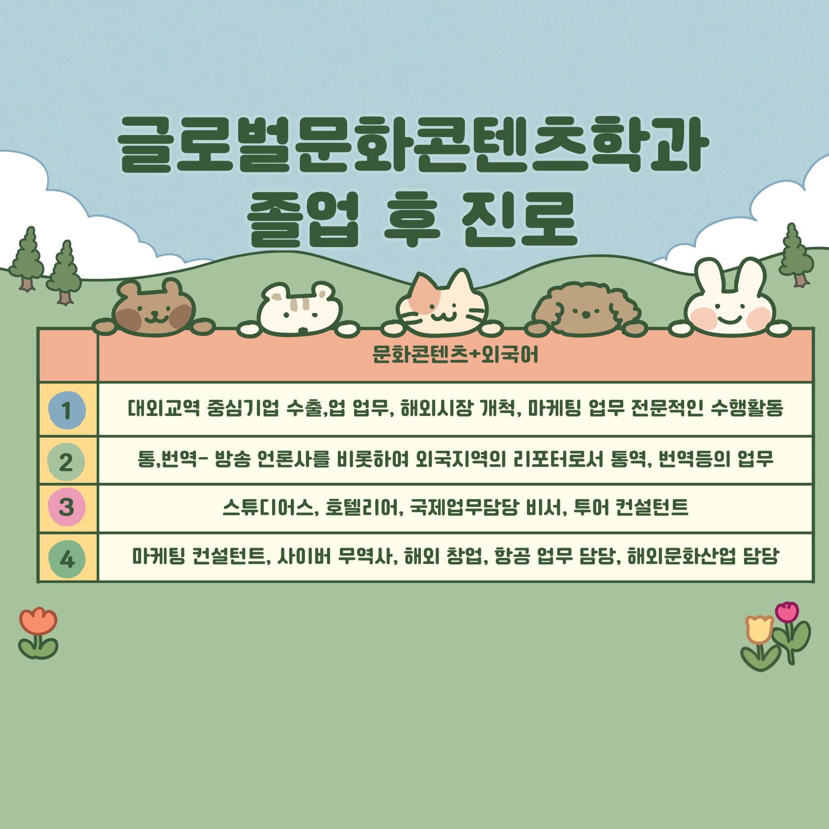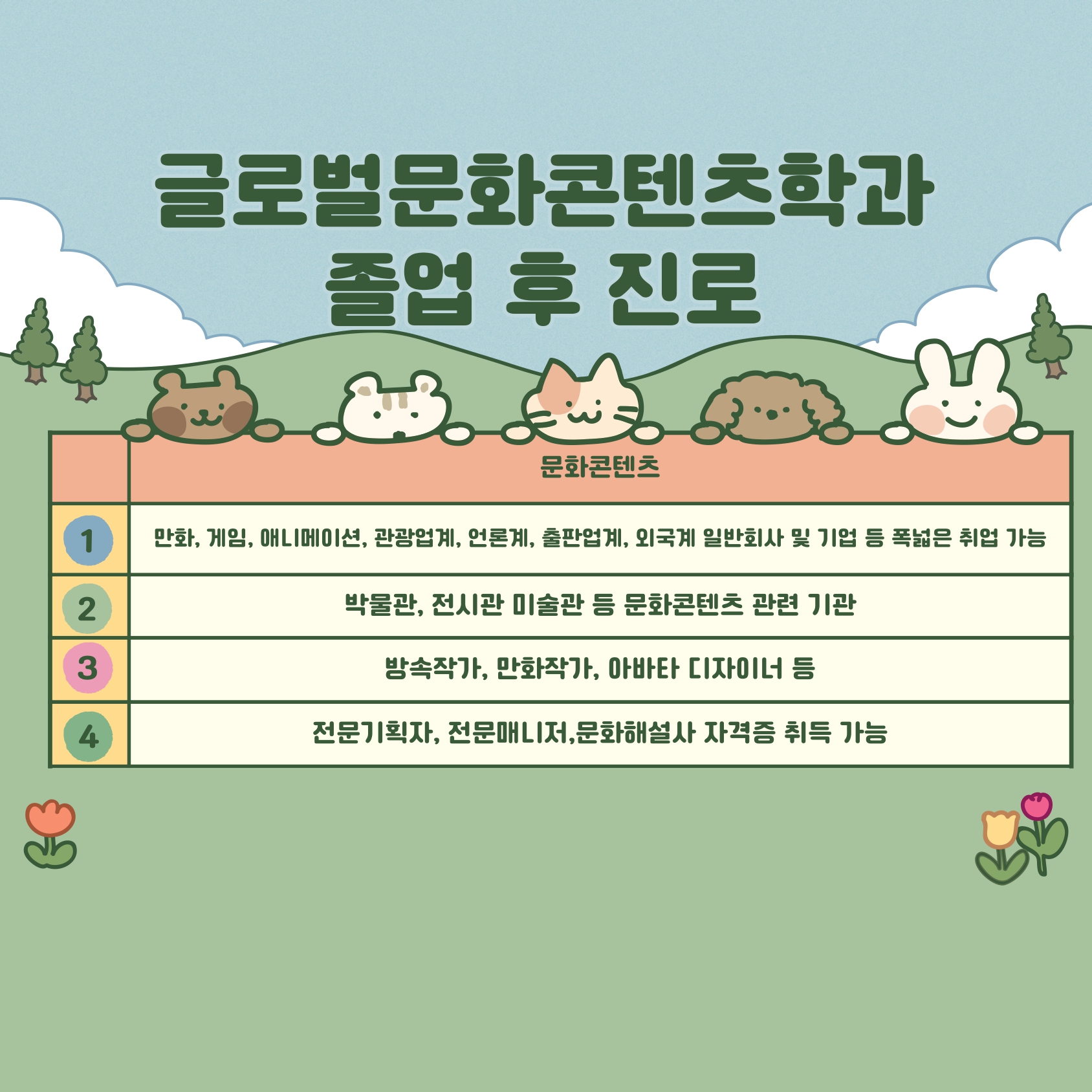 - 만화, 게임, 애니메이션, 테마파크, 문화·기획분야, 관광업계, 언론계, 출판업계, 외국계 일반회사 및 기업 등 폭넓은 취업 가능