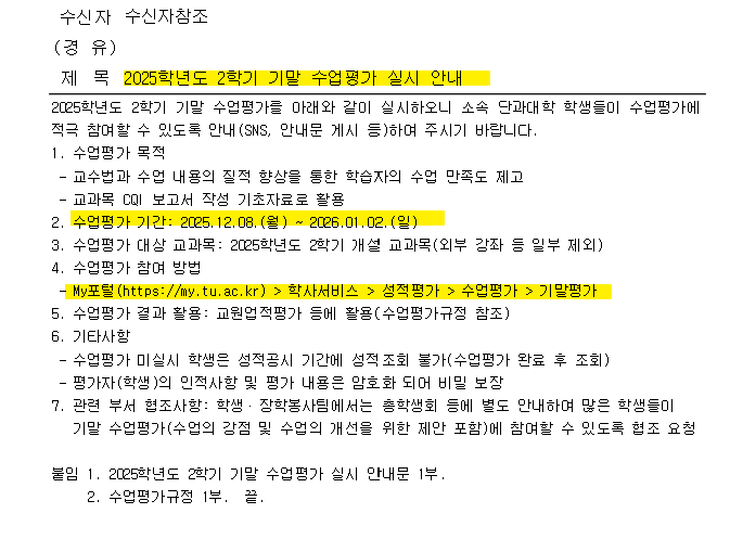 2025학년도 2학기 기말 수업평가 실시 안내