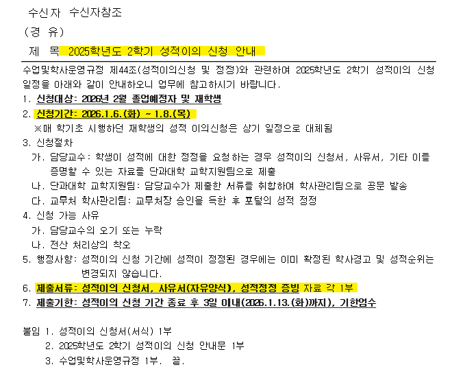 2025학년도 2학기 성적이의 신청 안내