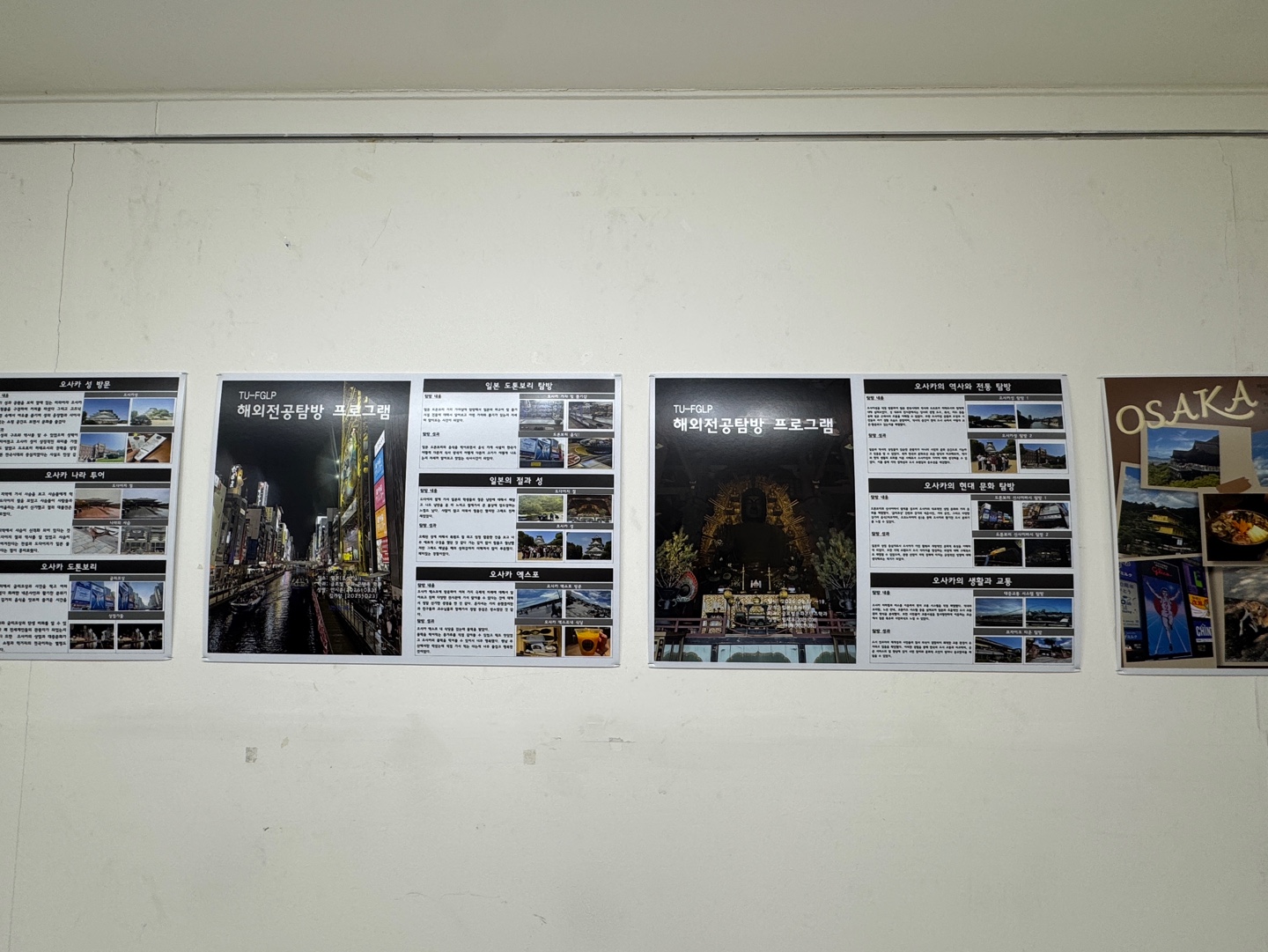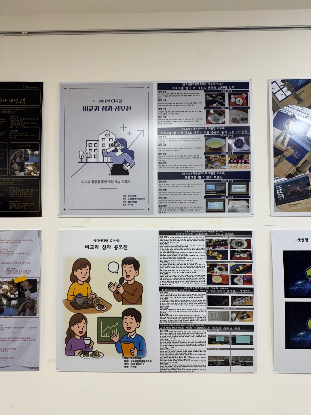 CI사업 성과 공유전시회에서는 대학혁신지원사업비를 통해 진행된 1학년 학생들의 일본 문화탐방 후기, 비교과 성과공모전 수상작, 우수동아리 활동 등 다양한 작품이 전시되었습니다.