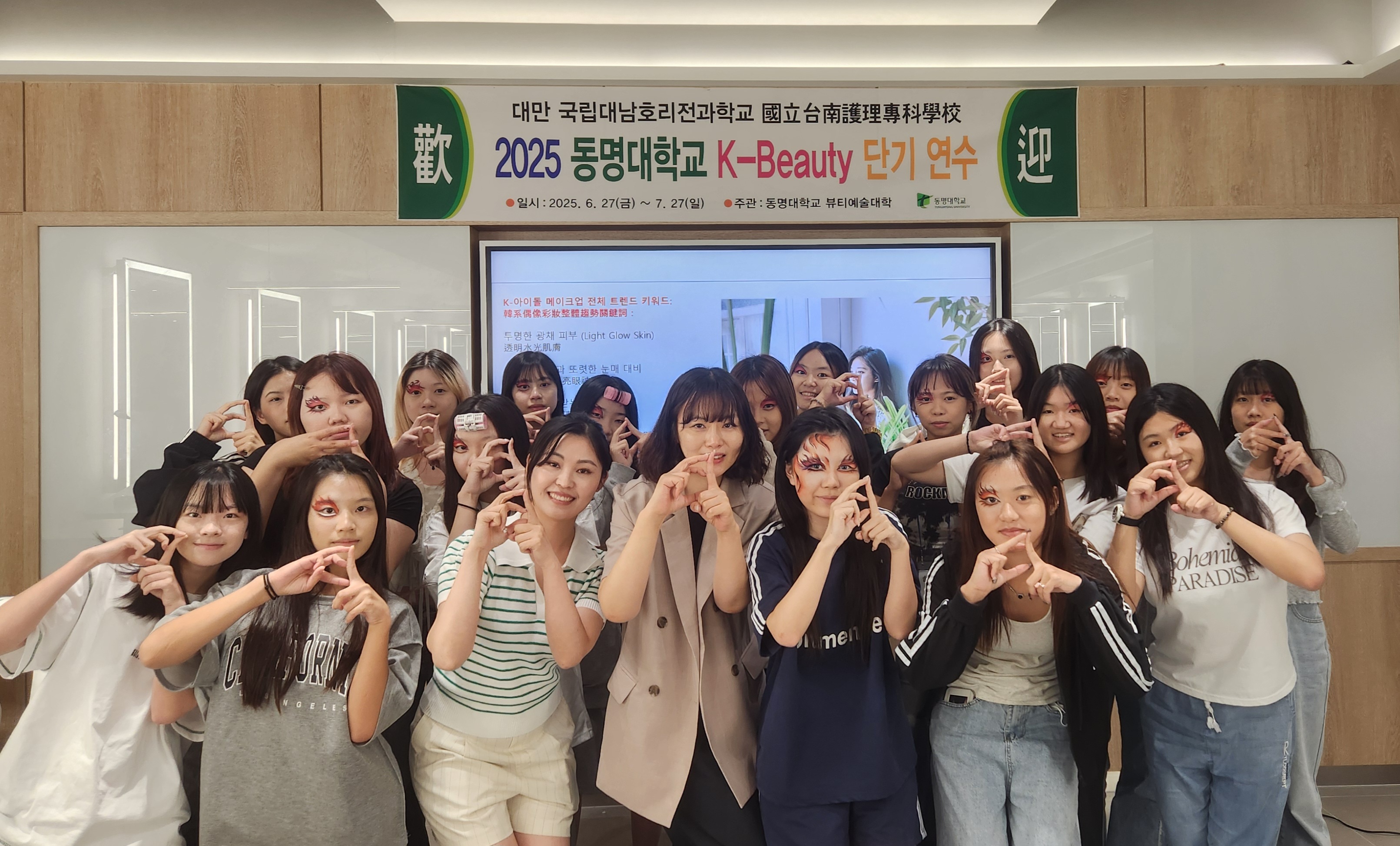 동명대학교 메이크업디자인학과는 최근 대만의 뷰티 전공 대학생을 대상으로 4일간의 메이크업 특강 프로그램을 성공적으로 마무리하였습니다. 이번 프로그램은 K-뷰티 실무 교육과 동양 문화에 대한 창의적 접근을 융합한 글로벌 뷰티 교육 콘텐츠로 높은 호응을 얻었습니다.