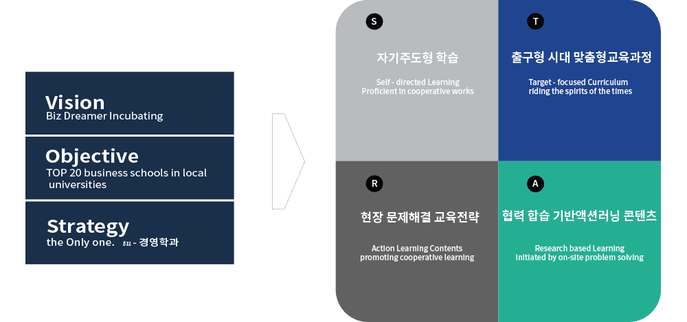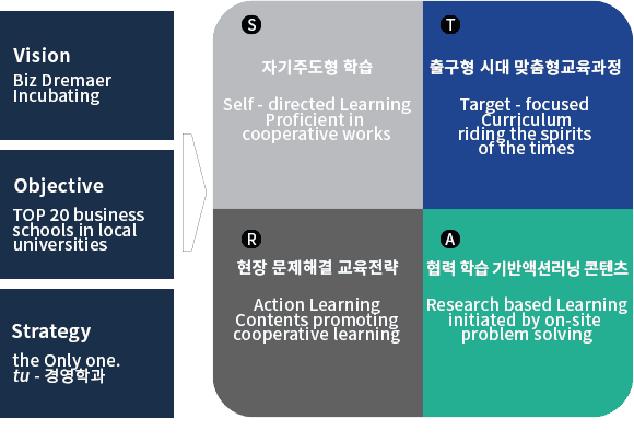 [실천 이니셔티브] 목표체계 수행을 위한 유일 특성화(the Only one, tu-경영학과) 전략의 실천 이니셔티브를 STAR로 브랜딩하였다. STAR를 파자하면, S는 교수학습법에서 협업에 익숙한 자기주도형 학습(Self-directed learning)을, T는 교육과정에서 시대정신에 부응하는 출구 맞춤형 교육과정(Target-focused curriculum riding the spirits of the times)을, A는 교육내용에서 현업 적응력을 지닌 협력학습 기반 액션러닝 콘텐츠(Action-learning concents promoting cooperative learning)를, R은 실천이론화에서 연구분석과 실무교육이 융합된 현장 문제해결형 교육(Research based learning initiated by on-site problem solving)을 의미한다.