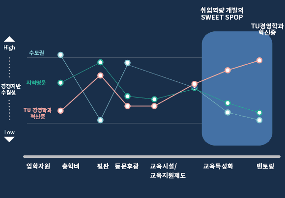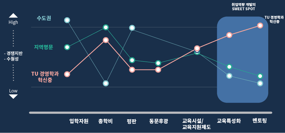 대학사회의 경쟁력 프로파일과 가치곡선을 살펴보면, 수도권 대학은 총학비를 제외한 모든 영역에서 지방 명문대에 비해 월등히 앞서 있는데 반해, tu-경영학과의 현실은 수도권 대학은 고사하고 지방 명문대와의 Gap 분석에서도 명확한 열위상태에 있음이 확인된다. 따라서 유일 특성화의 혁신은 레드오션마켓의 상태에 있는 현재와 미래에서 블루오션의 틈새시장으로 진입할 수 있는 전략적 이니셔티브를 확보하는 것이며, 구체적으로는 학생 개인별 취업역량의 극대화이다.