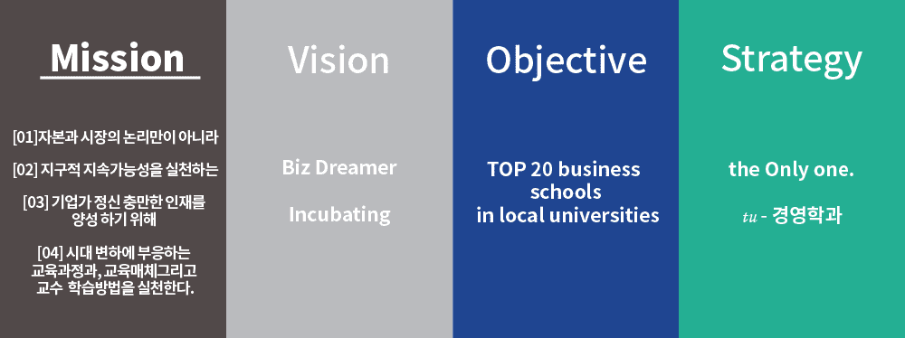 tu-경영학과의 미션은 자본과 시장의 논리만이 아니라 지구적 지속가능성을 실천하는 기업가 정신 충만한 인재를 양성하기 위해 시대 변화에 부응하는 교육과정과 교육매체 그리고 교수학습방법을 실천하는데 있다