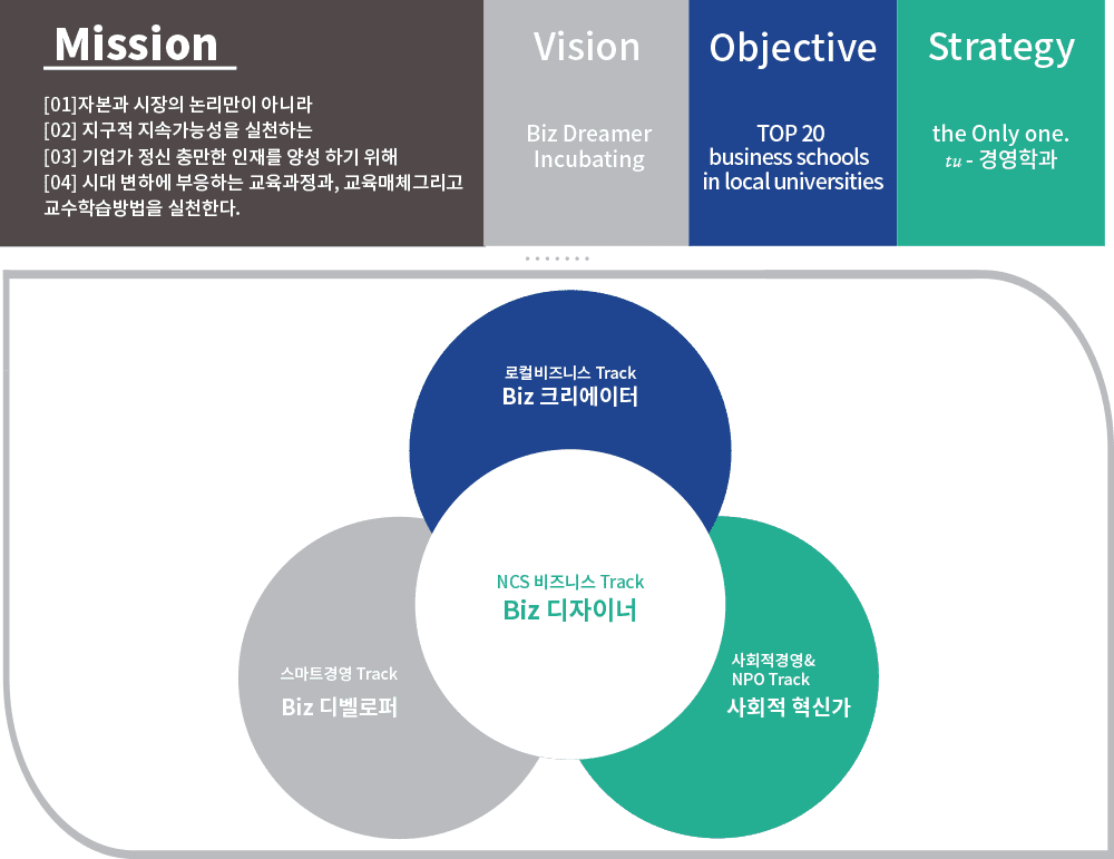 약탈적 경쟁환경과 열악한 보유자원을 감안할 때, 메이저 학과들과 경쟁하여 미션을 실천하기 위해서는 선택과 집중의 원칙에 따라 학과 교육체계를 특성화해야 하고 지속적 혁신을 통해 타대학과 차별화하는 길 밖에는 없기에 우리는 유일 특성화(the Only one, tu-경영학과)를 전략으로 수립하였다.