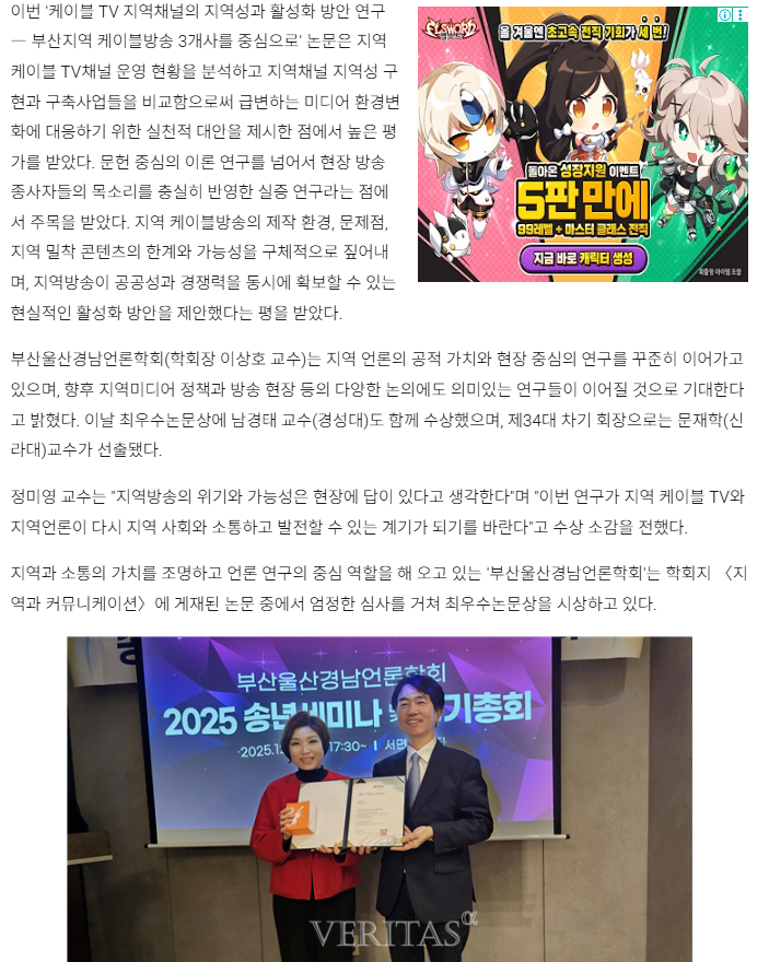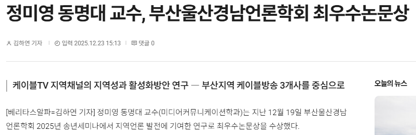 정미영 동명대 교수, 부산울산경남언론학회 최우수논문상