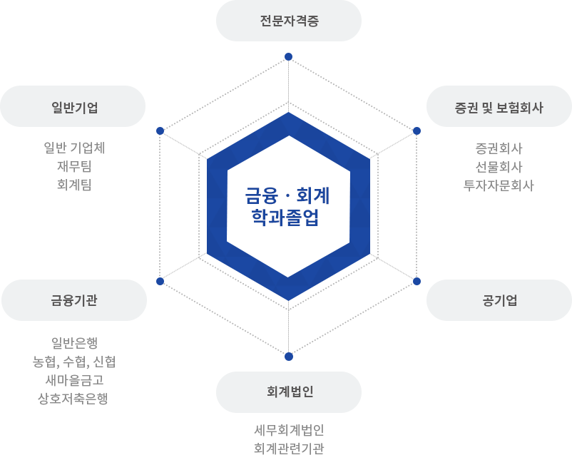 금융·회계학과는 재무·금융·회계·세무분야 인재의 사회적 수요 증가로 인해 다양한 진로가 열려 있습니다. 또한 부산지방국세청, 부산지방세무사회와 연계한 실무중심의 교육을 통해 재무·회계 및 세무분야의 전문가를 양성하여 기업체의 재무·회계부서 및 회계법인으로의 진로가 열려있습니다.