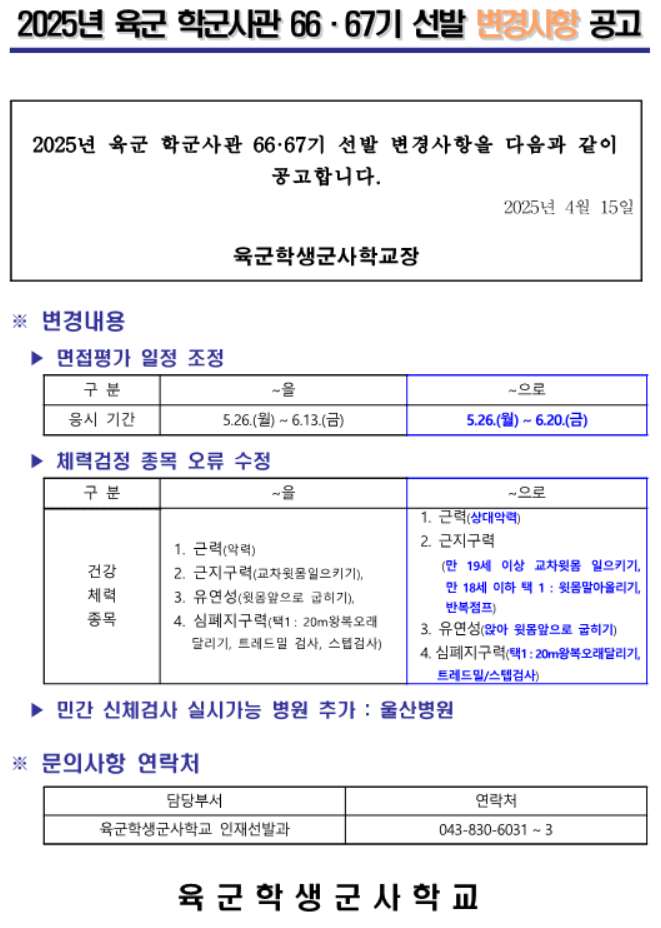 (육군)2025년 육군 학군사관 66, 67기 선발 변경사항 공고