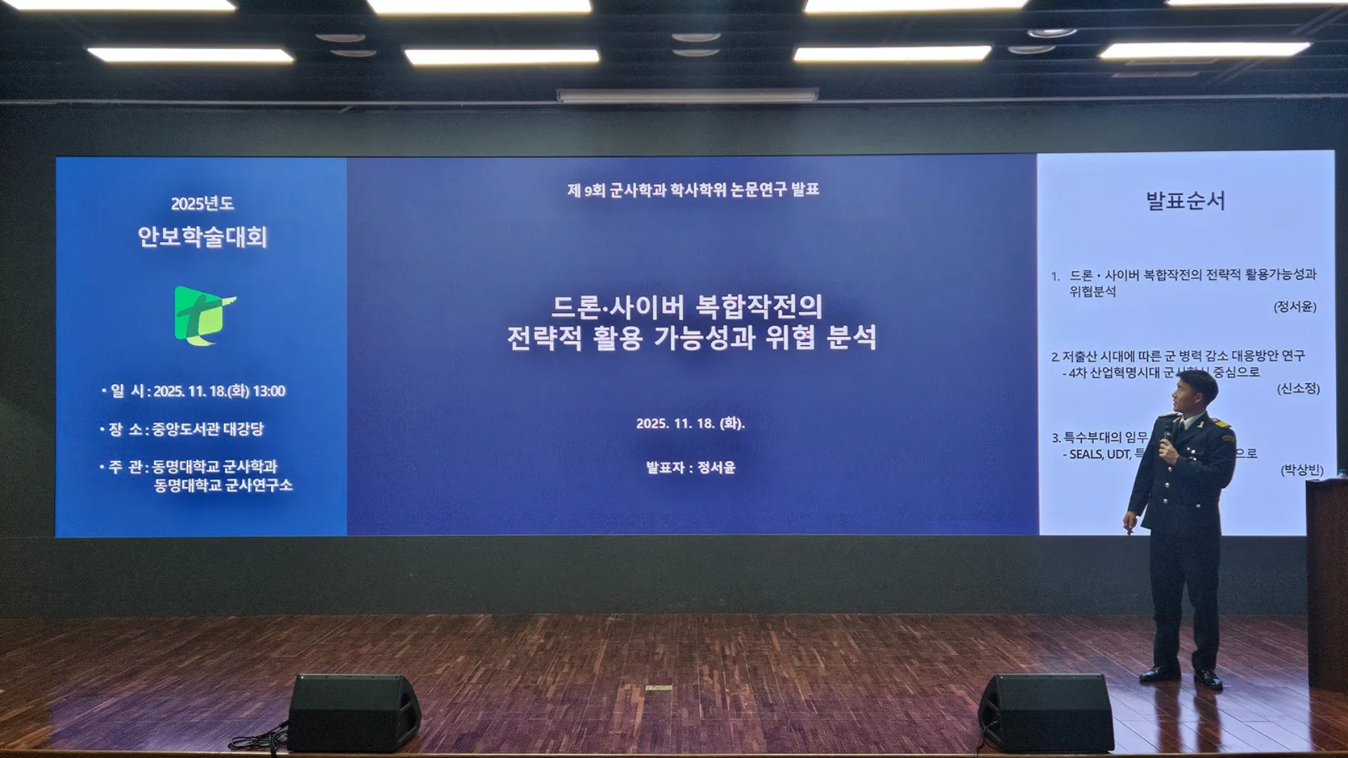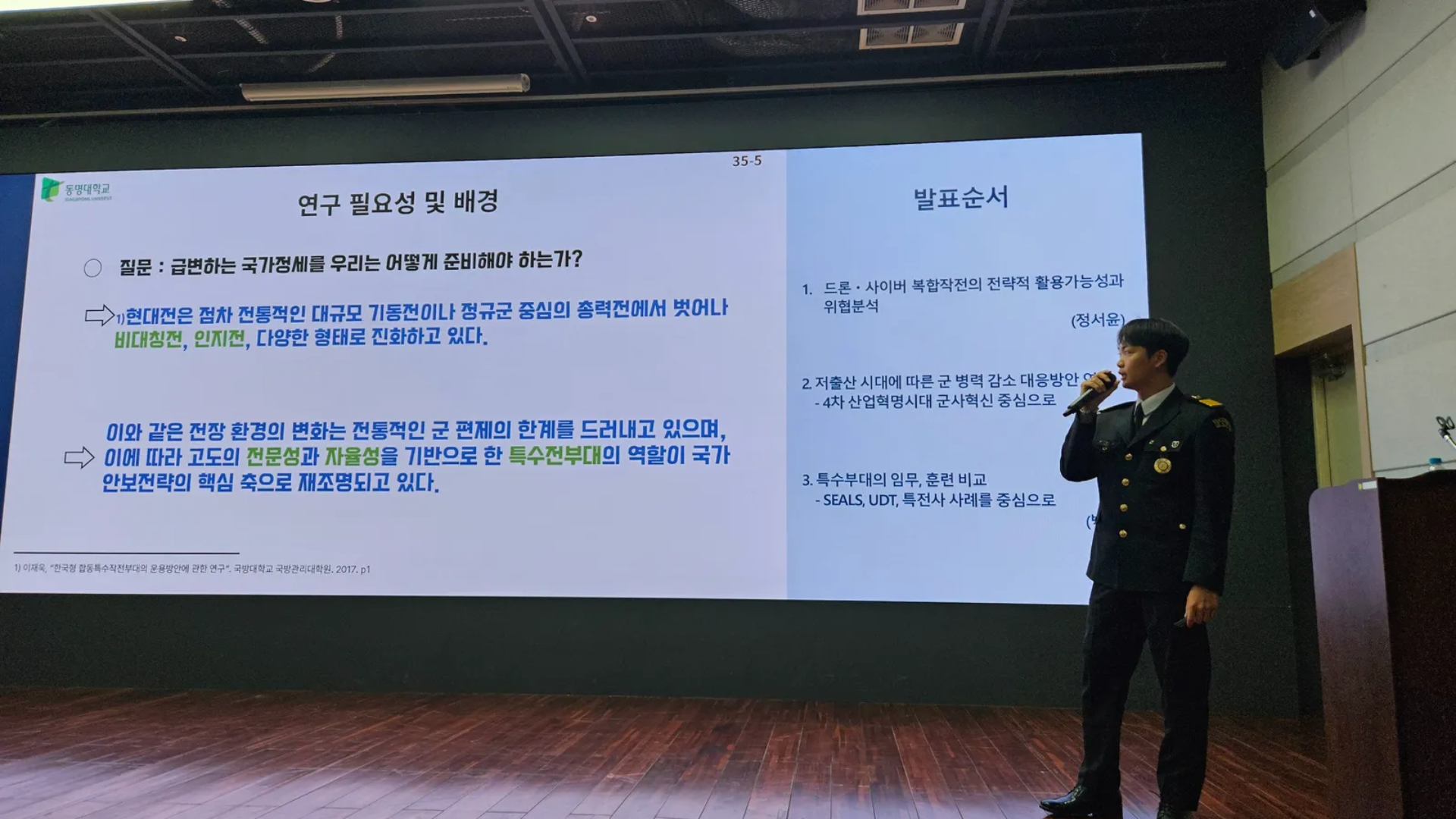 동명군사학술제 - 군사학과장 개회사, 군사전문가 초청특강(김영택 강사), 졸업생 연구 논문 발표 및 토의 / 시상식(군사연구소장)
