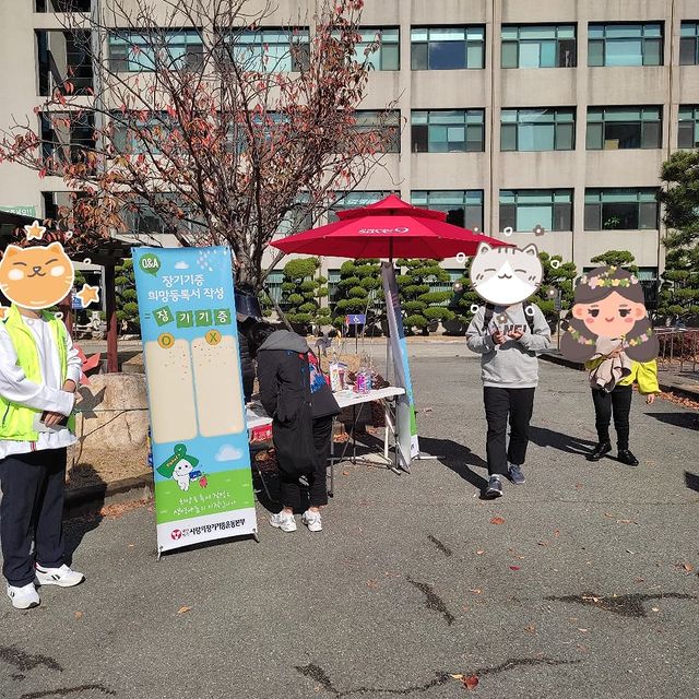 동명대학교 사회과학관 옆에서 장기기증관련 캠페인 중이에요.