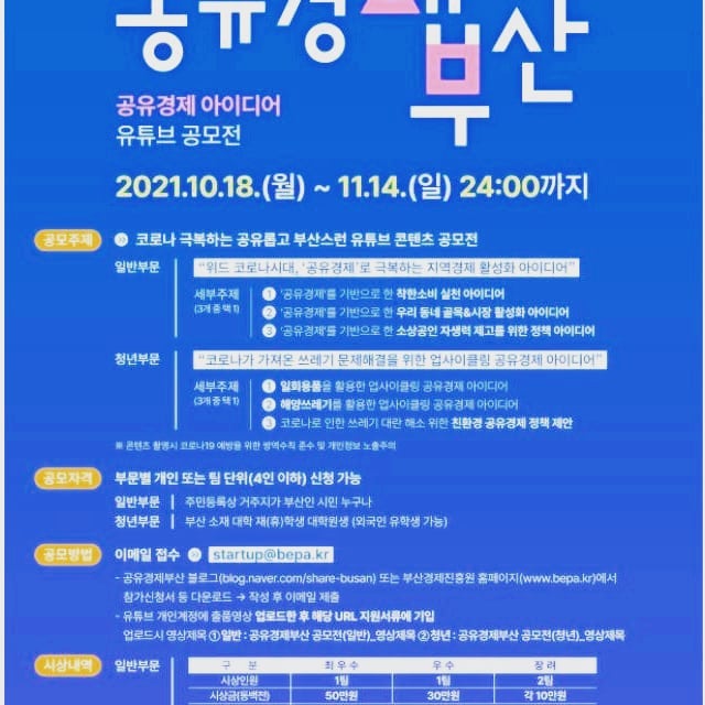 부산경제진흥원은 14일까지 공유경제를 주제로 유튜브 콘텐츠 공모전을 진행한다고 8일 밝혔다.