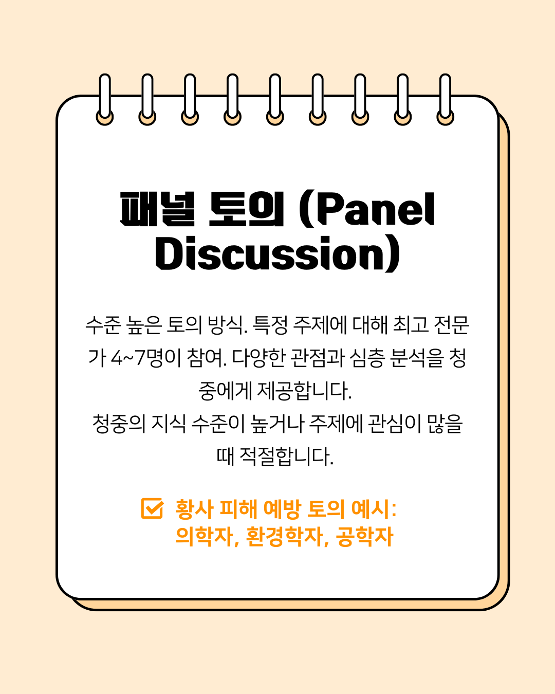 수준 높은 토의 방식으로, 특정 주제에 대해 4~7명의 최고 전문가들이 참여합니다. 청중의 지식 수준이 높거나 주제에 관심이 많을 때 적합하며, 전문가들의 깊이 있는 분석을 들을 수 있습니다.