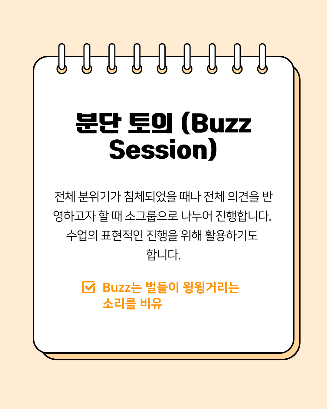 전체 분위기가 침체되었거나 모두의 의견을 반영하고 싶을 때 사용합니다. 소그룹으로 나누어 진행하며, 마치 벌들이 윙윙거리는 소리처럼 활기차게 의견을 나눈다는 의미를 담고 있습니다.