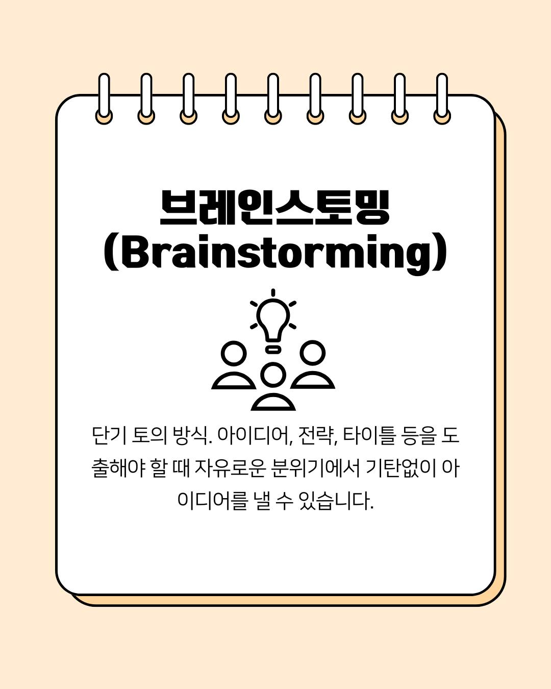 짧은 시간 안에 창의적인 아이디어나 전략을 도출해야 할 때 활용합니다. 자유로운 분위기에서 비판 없이 기탄없이 아이디어를 쏟아내는 것이 핵심입니다!