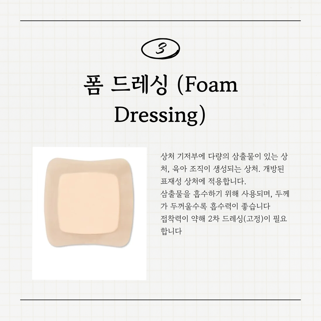 3๏ธโฃ ํผ ๋๋ ์ฑ (Foam Dressing)์ฉ๋: ๋ค๋์ ์ผ์ถ๋ฌผ์ด ์๋ ์์ฒ, ์ก์ ์กฐ์ง์ด ์์ฑ๋๋ ์์ฒ, ๊ฐ๋ฐฉ๋ ํ์ฌ์ฑ ์์ฒ์ ์ ํฉํฉ๋๋ค.