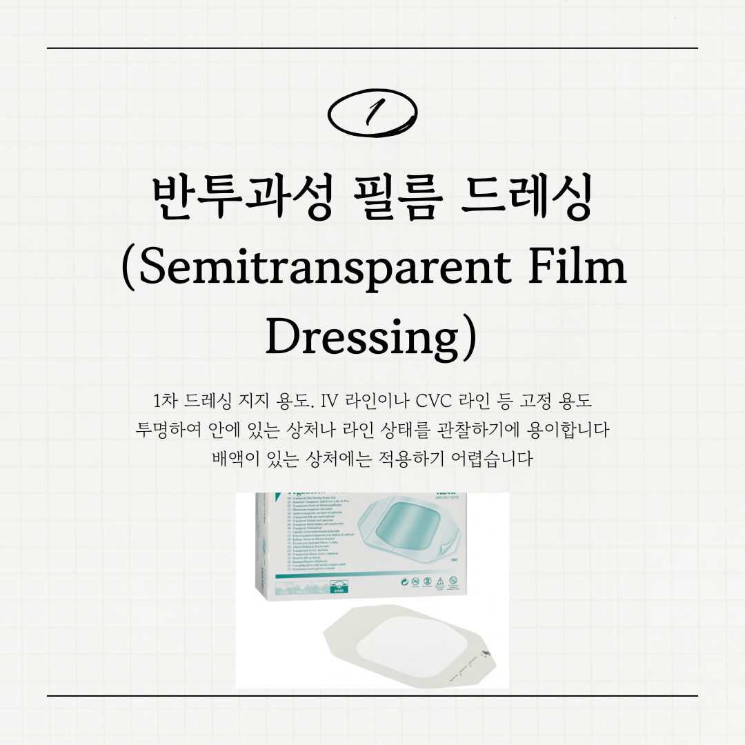 1๏ธโฃ ๋ฐํฌ๊ณผ์ฑ ํ๋ฆ ๋๋ ์ฑ (Semitransparent Film Dressing)์ฉ๋: 1์ฐจ ๋๋ ์ฑ์ ์ง์งํ๊ฑฐ๋ IV ๋ผ์ธ, CVC ๋ผ์ธ ๋ฑ์ ๊ณ ์ ํ ๋ ์ฃผ๋ก ์ฌ์ฉํฉ๋๋ค.