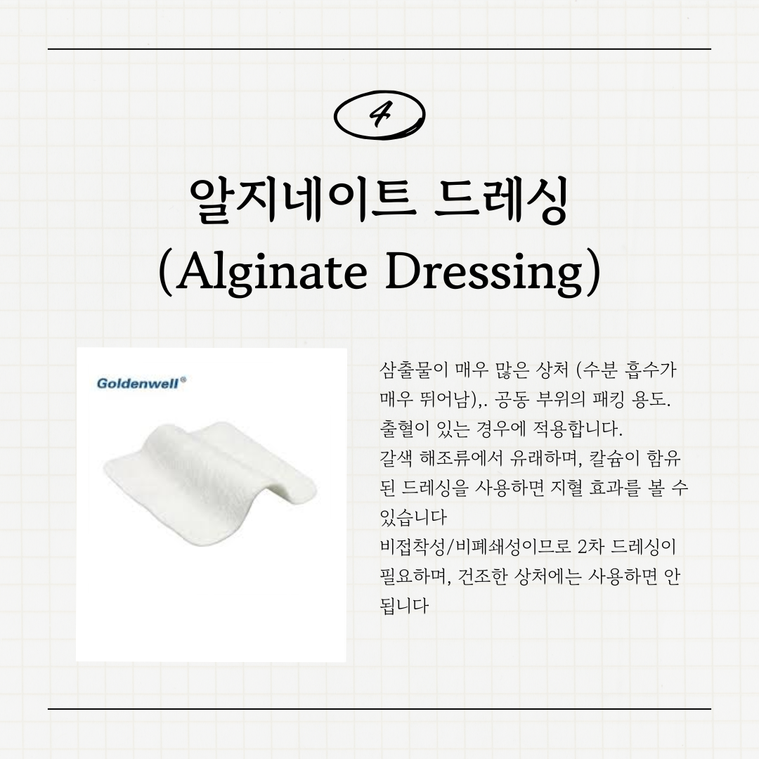 4๏ธโฃ ์์ง๋ค์ดํธ ๋๋ ์ฑ (Alginate Dressing)์ฉ๋: ์ผ์ถ๋ฌผ์ด ๋งค์ฐ ๋ง์ ์์ฒ๋ ์ถํ์ด ์๋ ๊ฒฝ์ฐ, ๊ณต๋ ๋ถ์์ ํจํน์ฉ์ผ๋ก ์ฌ์ฉํฉ๋๋ค.
