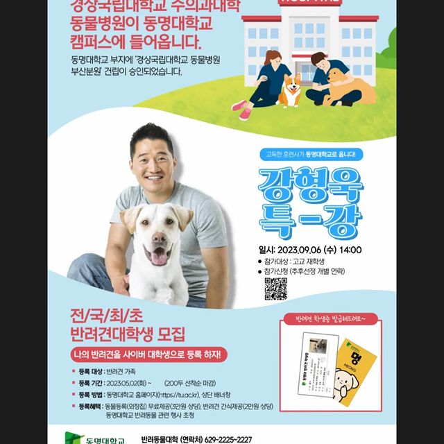 WOW~ 고독한 조련사 #강형욱 훈련사 #동명대학교 에 온다~ 동명대학교에 어마무시한 #동물병원 이 들어온다고 하네요~ 전국최초 #반려견대학생 모집~ 반
