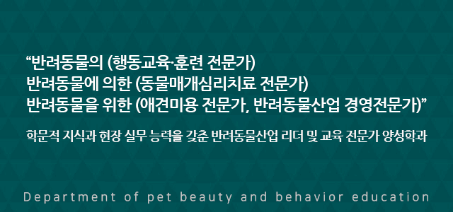 반려동물의 아름다움과 건강, 반려동물 행동교정 및 반려견 훈련에 관련된 전문 인력과 반려동물 산업 경영전문가 그리고 동물을 통한 사람의 심리적 치유를 도모하는 반려동물 매개치료 전문가 양성이 요구되고 있습니다.