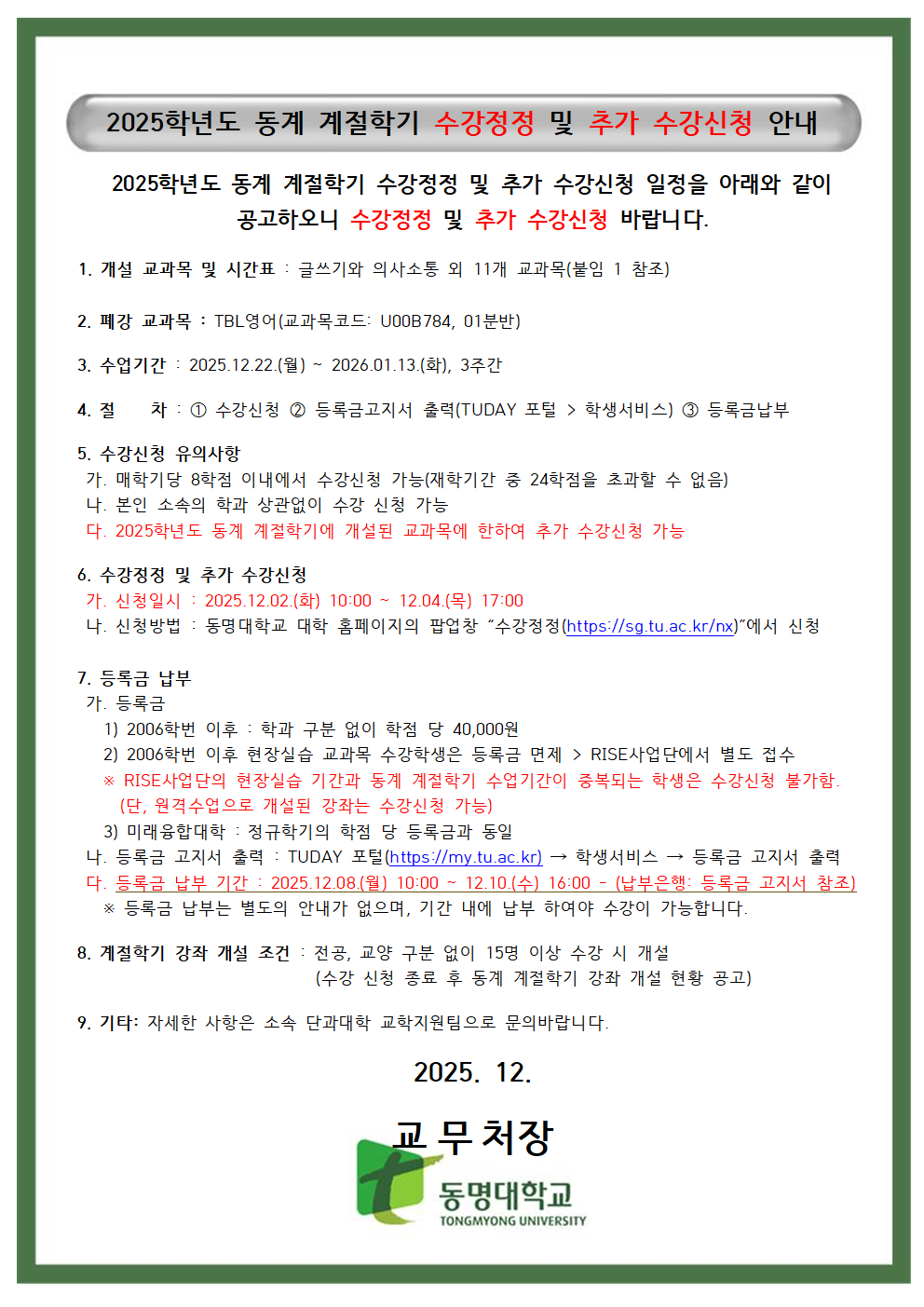 2025학년도 동계 계절학기 수강정정 및 추가 수강신청 안내