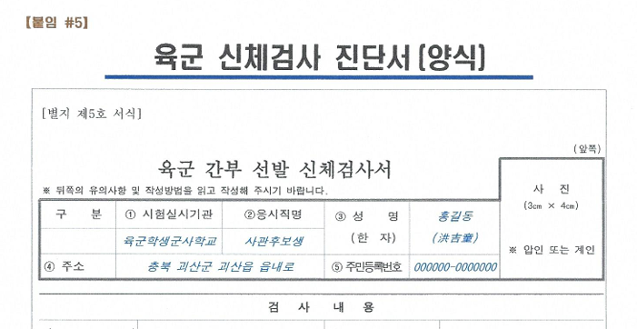 - 병원 도착 후 육군 신체검사 진단서(약식) 작성해야 함.(시험실시기간, 응시직명, 주소 /주민번호 / 성명(한자포함))