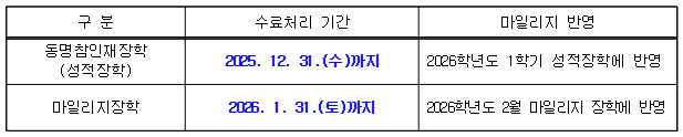* 동명참인재장학의 자격증 및 봉사 마일리지는 2025. 12. 24.(수)까지 t-UP에 업로드 하시길 바랍니다.